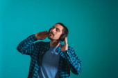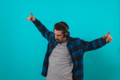 Młody przystojny mężczyzna tańczący i śpiewający piosenki słuchające muzyki w słuchawkach na niebieskim tle. Szczęśliwy mężczyzna cieszyć się muzyką.