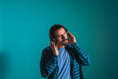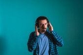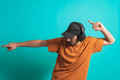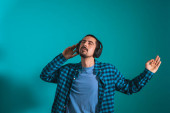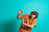 Zdjęcie "Młody przystojny mężczyzna tańczący i śpiewający piosenki słuchające muzyki w słuchawkach na niebieskim tle. Szczęśliwy mężczyzna cieszyć się muzyką." może być wykorzystywane do celów osobistych i komercyjnych zgodnie z warunkami zakupionej licencji Royalty-free. Obraz jest dostępny do pobrania w jakości wysokiej rozdzielczości do 5760x3840.