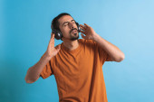 Młody przystojny mężczyzna tańczący i śpiewający piosenki słuchające muzyki w słuchawkach na niebieskim tle. Szczęśliwy mężczyzna cieszyć się muzyką.