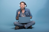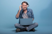 Zdjęcie "Młody przystojny mężczyzna tańczący i śpiewający piosenki słuchające muzyki w słuchawkach na niebieskim tle. Szczęśliwy mężczyzna cieszyć się muzyką." może być wykorzystywane do celów osobistych i komercyjnych zgodnie z warunkami zakupionej licencji Royalty-free. Obraz jest dostępny do pobrania w jakości wysokiej rozdzielczości do 5760x3840.