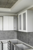 Zdjęcie "Niestandardowe szafy kuchenne montaż z białymi fasadami mebli mdf. Szara modułowa kuchnia z płyty wiórowej na różnych etapach instalacji. Meble ramowe fronty profilu mdf." może być wykorzystywane do celów osobistych i komercyjnych zgodnie z warunkami zakupionej licencji Royalty-free. Obraz jest dostępny do pobrania w jakości wysokiej rozdzielczości do 5760x3840.