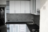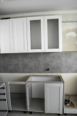 Niestandardowe szafy kuchenne montaż z białymi fasadami mebli mdf. Szara modułowa kuchnia z płyty wiórowej na różnych etapach instalacji. Meble ramowe fronty profilu mdf.