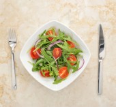 Pyszna sałatka z kurczakiem, rukolą i pomidorami na szarym stole. Miejsce na tekst