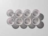 Cztery srebrne metalowe wieszaki na szarym tle, widok z tyłu