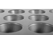 Gotowanie, pieczenie i koncepcja domu. Zbliżenie pustych form muffinek