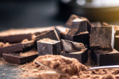 Posiekane kostki czekolady z proszkiem kakaowym i anyżem gwiazdkowym na ciemnym tle z przestrzenią do kopiowania, widok z bliska.