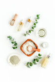 Eukaliptusowy olejek eteryczny, eukaliptusowe liście na białym tle. Naturalne, ekologiczne kosmetyki. Lekarskie, naturalne surowice. Płaskie ułożenie, widok z góry.