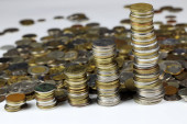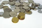 fotografia z metalowymi monetami o różnych kształtach, krajach i wartościach, w kolumnach o różnej wysokości