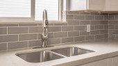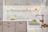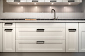 Zdjęcie "Prosta i elegancka kuchnia z drewnianym blatem, białymi szafkami, szufladami i czarnym zlewem." może być wykorzystywane do celów osobistych i komercyjnych zgodnie z warunkami zakupionej licencji Royalty-free. Obraz jest dostępny do pobrania w jakości wysokiej rozdzielczości do 5760x3840.