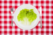 Odchudzanie dieta niskokaloryczny pojedynczy liść sałaty bokiem na małej białej płytce ze sztućcami po obu stronach na czerwonym tle tkaniny z drewnianym stołem