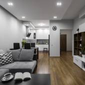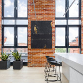 Przestronna kuchnia z ceglanymi ścianami, diodami LED i białymi filarami