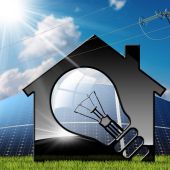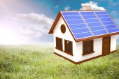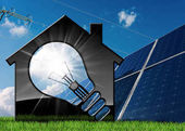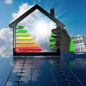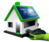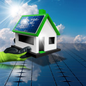 Zbliżenie dłoni z rękawicą ochronną pokazującą mały model domu z panelami słonecznymi na dachu i na tle. Koncepcja energii odnawialnej. Fotografia i ilustracja 3D.