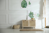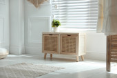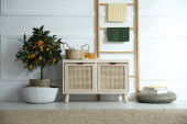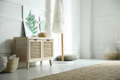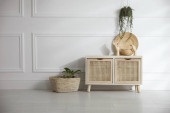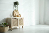 Zdjęcie "Drewniana toaleta w pobli? u bia? ej ściany w pokoju. Projekt wnętrza" może być wykorzystywane do celów osobistych i komercyjnych zgodnie z warunkami zakupionej licencji Royalty-free. Obraz jest dostępny do pobrania w jakości wysokiej rozdzielczości do 5760x3840.
