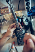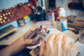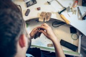 Blisko ręce jubilera, złotników podejmowania srebrny pierścień z kamienia szlachetnego za pomocą profesjonalnych narzędzi.