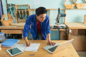 Zdjęcie "Uśmiechnięta młoda stolarka pokazująca na ekranie komputer typu coworker tablet z projektem mebli" może być wykorzystywane do celów osobistych i komercyjnych zgodnie z warunkami zakupionej licencji Royalty-free. Obraz jest dostępny do pobrania w jakości wysokiej rozdzielczości do 5760x3840.