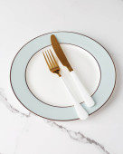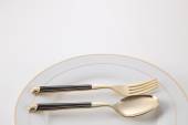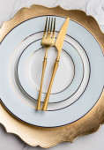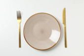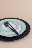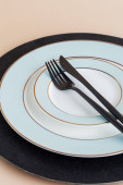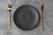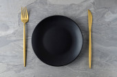 Zdjęcie "Pusty talerz z widelcem i nożem na czarnym tle. Złoto i czarna zastawa stołowa z białą płytą w ciemności. Widok z góry, płaski" może być wykorzystywane do celów osobistych i komercyjnych zgodnie z warunkami zakupionej licencji Royalty-free. Obraz jest dostępny do pobrania w jakości wysokiej rozdzielczości do 5760x3840.