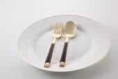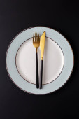 Pusty talerz z widelcem i nożem na czarnym tle. Złoto i czarna zastawa stołowa z białą płytą w ciemności. Widok z góry, płaski