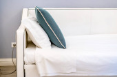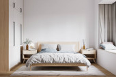 Zdjęcie "Mała sypialnia z białymi żaluzjami na ścianie i szklanych drzwiach" może być wykorzystywane do celów osobistych i komercyjnych zgodnie z warunkami zakupionej licencji Royalty-free. Obraz jest dostępny do pobrania w jakości wysokiej rozdzielczości do 5760x3840.
