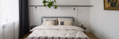 Mała sypialnia z białymi żaluzjami na ścianie i szklanych drzwiach