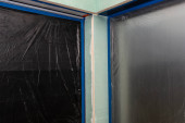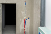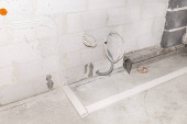 Nowo zainstalowana rama WC do toalety montowanej na ścianie, wykonana z płyt gipsowo-kartonowych, w łazience.
