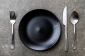 Puste puste czarne płytki z widelcem i nożem na czarnym tle łupku służącego pokładzie. Szykuj się. Widok z góry.