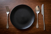 Zdjęcie "Puste puste czarne płytki z widelcem i nożem na czarnym tle łupku służącego pokładzie. Szykuj się. Widok z góry." może być wykorzystywane do celów osobistych i komercyjnych zgodnie z warunkami zakupionej licencji Royalty-free. Obraz jest dostępny do pobrania w jakości wysokiej rozdzielczości do 5760x3840.