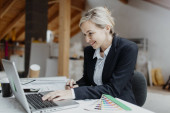 młoda przedsiębiorczyni pracująca na komputerze w miejscu pracy