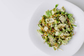 Zdjęcie "Świeża sałatka mieszana z awokado i sosem na konkretnym tle. Ekologiczna zdrowa sałatka z góry lodowej, awokado i ogórka z oliwą z oliwek i nasionami sezamu. Zdrowa sałatka zielona z mikrozieloną. " może być wykorzystywane do celów osobistych i komercyjnych zgodnie z warunkami zakupionej licencji Royalty-free. Obraz jest dostępny do pobrania w jakości wysokiej rozdzielczości do 5760x3840.