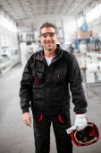 Portret pracownika w fabryce. Przystojniak pije kawę w fabryce..