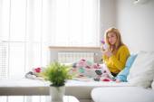 Młoda chora kobieta bierze pigułki. Piękna kobieta siedząca na kanapie z bólem brzucha.