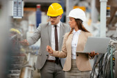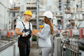 Zdjęcie "Pracownik fabryki i inżynier przeprowadzający inspekcję. Pracownik fabryki i bizneswoman na linii produkcyjnej." może być wykorzystywane do celów osobistych i komercyjnych zgodnie z warunkami zakupionej licencji Royalty-free. Obraz jest dostępny do pobrania w jakości wysokiej rozdzielczości do 5760x3840.