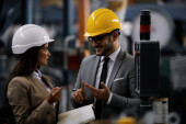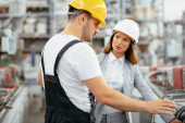 Pracownik fabryki i inżynier przeprowadzający inspekcję. Pracownik fabryki i bizneswoman na linii produkcyjnej.