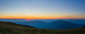 Pierwsze lub ostatnie promienie słońca na przełęczy górskiej. Rano i wieczorem w naturze. Kolorowy zachód i wschód słońca nad górskimi wzgórzami. Karpaty latem i jesienią.