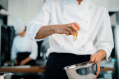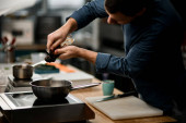 zbliżenie rąk kucharza, który delikatnie obiera cebulę nożem