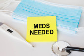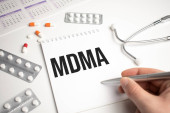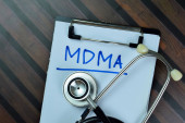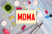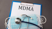 Żółta naklejka z napisem MDMA leżąca na maskach i stetoskopie. Koncepcja medyczna