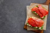 łosoś kanapka ryba Smorrebrod bruschetta owoce morza owoce morza na stole zdrowy posiłek przekąska górny widok kopia przestrzeń dla tekstu żywności tło pescetarian
