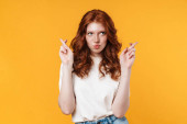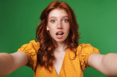 Imbir piękne szokujące dziewczyna wykrzykując i wskazując palce na bok izolowane na białym tle