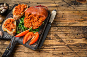Zdjęcie "Sobrassada wyleczył kiełbasę wieprzową na plasterku chleba. Ciemne drewniane tło. Widok z góry" może być wykorzystywane do celów osobistych i komercyjnych zgodnie z warunkami zakupionej licencji Royalty-free. Obraz jest dostępny do pobrania w jakości wysokiej rozdzielczości do 5760x3840.