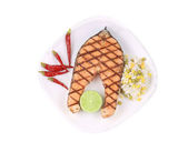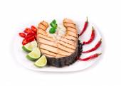 Grillowany stek łososiowy ze szparagami i pomidorami wiśniowymi na białym talerzu wyizolowanym na białym tle