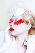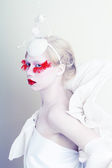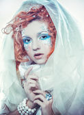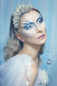 Wewnętrzny portret pięknej kobiety ubierającej się jak postać fantasy w niebieską sukienkę i kwiatową koronę