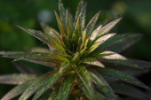 Lily z kroplami rosy w wiosennym ogrodzie. Soczyste liście Maroon. Lily i krople deszczu na liściach. Pojęcie czystości w naturze.