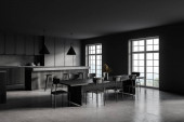 Nowoczesne wnętrze kuchni z szarymi ścianami, betonową podłogą oraz szarymi i drewnianymi blatami. Długi stół z krzesłami w pobliżu. 3d renderowanie