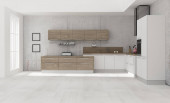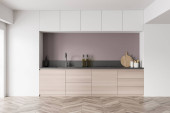 Biały minimalistyczny zestaw kuchenny z urządzeniami i półkami, widok z przodu. Lekka, luksusowa kuchnia na czarnej parkiecie w pobliżu okna, renderowanie 3D bez ludzi