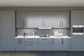 Zdjęcie "Biały minimalistyczny zestaw kuchenny z urządzeniami i półkami, widok z przodu. Lekka, luksusowa kuchnia na czarnej parkiecie w pobliżu okna, renderowanie 3D bez ludzi" może być wykorzystywane do celów osobistych i komercyjnych zgodnie z warunkami zakupionej licencji Royalty-free. Obraz jest dostępny do pobrania w jakości wysokiej rozdzielczości do 5760x3840.