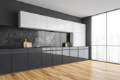 Zdjęcie "Czarno-szary minimalistyczny zestaw kuchenny z wyposażeniem i kuchenką, widok z przodu. Ciemna luksusowa kuchnia na marmurowej podłodze, 3D renderowania bez ludzi" może być wykorzystywane do celów osobistych i komercyjnych zgodnie z warunkami zakupionej licencji Royalty-free. Obraz jest dostępny do pobrania w jakości wysokiej rozdzielczości do 5760x3840.