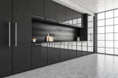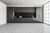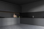 Czarno-szary minimalistyczny zestaw kuchenny z wyposażeniem i kuchenką, widok z przodu. Ciemna luksusowa kuchnia na marmurowej podłodze, 3D renderowania bez ludzi