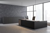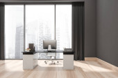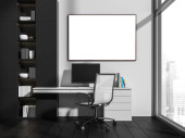 Rama płótna makietowego w biało-czarnym biurze biznesowym z minimalistycznymi meblami, widok z boku. Stół z lampą i komputerem w pobliżu okna, renderowanie 3D bez ludzi