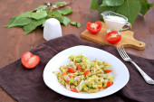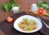 Zdjęcie "Tabbouleh, pietruszka, pomidor i sałatka warzywna ogórkowa z bulwą w glinianym talerzu na tle betonu oliwnego. Przepisy sałatkowe. Zdrowe jedzenie. Wegańskie." może być wykorzystywane do celów osobistych i komercyjnych zgodnie z warunkami zakupionej licencji Royalty-free. Obraz jest dostępny do pobrania w jakości wysokiej rozdzielczości do 5760x3840.