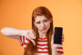 Zdjęcie "Koncepcja zakupów online. Wściekła wibrująca dziewczyna wskazująca na ekran telefonu komórkowego, wygląda na rozczarowaną, stojąca na beżowym tle" może być wykorzystywane do celów osobistych i komercyjnych zgodnie z warunkami zakupionej licencji Royalty-free. Obraz jest dostępny do pobrania w jakości wysokiej rozdzielczości do 5760x3840.