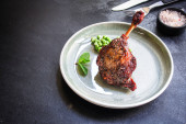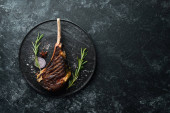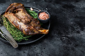 Pieczona jagnięcina. Mroczne tło. Widok góry. Przestrzeń kopiowania